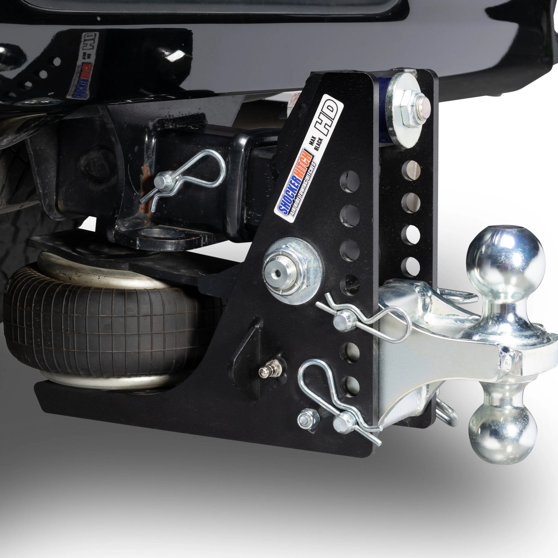- Complete Kit Includes: Shocker HD Max Black receiver hitch base frame assembly with built in 20K air bag & dual bump cushions, ball mount you choose and two d-handle ball mount hitch pins.
